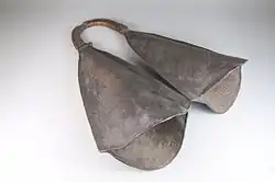 Die für Afrika charakteristischsten Musikinstrumente aus Eisen sind Einfach- und Doppelglocken ohne Klöppel, die vor allem in einigen Gebieten Westafrikas und im westlichen Zentralafrika vorkommen. Ansonsten wird noch zur Herstellung von Klöppelglocken, Schellen und Lamellophonen Eisen verwendet. Zu den Klöppelglocken gehört eine rechteckige Glocke aus umgebogenem Eisenblech in Uganda, in deren schlitzförmiger Öffnung zwei Klöppel nebeneinander hängen. Eine Doppelglocke mit Klöppeln der Azande aus dem Kongo wurde 1913 als abanangbweli katalogisiert. Die Klöppel hängen an einer Drahtschlaufe, die zugleich zum Festhalten dient.[80] Die Glocke kündigte die Ankunft des Dorfoberhauptes an und erklang, wenn er bei Versammlungen trank oder rauchte.[81] Sie gehört zu einer Vielzahl unterschiedlich geformter Klöppelglocken aus geschmiedetem Eisen, die auch außerhalb Afrikas vorkommen.