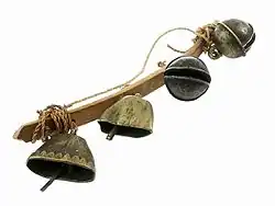 Bei den Turkvölkern und Mongolen war es üblich, Schellen aus zwei unterschiedlich geformten Halbschalen am Pferdegeschirr zu verwenden, sodass die eingeschlossenen Kügelchen zwei Töne hervorbrachten.[58] Pferdeglöckchen wurden im gesamten Römischen Reich in großer Zahl ausgegraben. Die Schellenklänge von langsam schreitenden Kamelen gaben im Persischen einem bestimmten Trommelrhythmus der klassischen persischen Musik den beschreibenden Namen zang-e schotor („Kamel-Glocken[rhythmus]“).[59] Als zang werden Glöckchen, Schellen oder Fingerzimbeln bezeichnet.