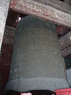 Mit der langsamen Ausbreitung des Buddhismus in China in den ersten nachchristlichen Jahrhunderten und des Daoismus bildeten sich bestimmte Glockentypen heraus, die für die Kultpraxis dieser Religionen geeignet waren, namentlich fozhong (etwa „Buddhanatur-Glocke“) oder fanzhong und daozhong („daoistische Glocke“).[40] Auf dem Gelände eines buddhistischen Tempels in Ostasien hängen große Glocken immer in einem offenen Pavillon oder einem separaten Turm dicht über dem Boden, damit sie in einer Ritualhandlung vom Mönch oder den Gläubigen mit einer Holzstange kräftig am unteren Rand angeschlagen werden können. Die Glocken sind durchschnittlich bis zu zwei Meter hoch, einzelne Exemplare der buddhistischen Glocken, die vor allem in Japan gebräuchlich sind, können um einiges größer sein. Die Herstellung von teilweise riesigen Glocken geht auf die Vorstellung zurück, dass mit ihrem Klang eine spirituelle Kraft ausstrahlt. Die Bedeutung der Glocke wächst mit deren Gewicht.