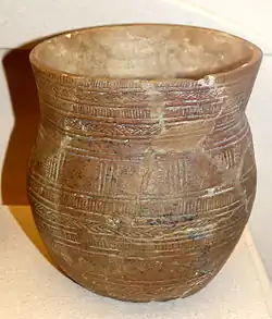 Der vollständig erhaltene Becher der Glockenbecherkultur besitzt ein gedrungenes S-Profil, ohne Bodenabsatz, mit einer Weite von 14,3 cm nahe dem unteren Viertel. Sein Mündungsdurchmesser beträgt 15 cm. Er hat eine Höhe von 19,6 cm und eine Standfläche von 7,7 cm. Die hellbraun-rötliche Oberfläche ist fast poliert. Der Ton ist fein geschlämmt und gemagert, im Bruch rot, mit hellgrauem Mittelstreifen. Das Dekor zeigt einen Wechsel von verzierten und unverzierten waagerecht umlaufenden Bereichen. Die fünf, etwa gleichmäßig verteilten flächig gefüllte Zierstreifen haben etwas unterschiedliche Breiten. Der unterste und oberste Zierstreifen haben einen geringeren Abstand zur Standfläche bzw. zur Gefäßmündung. Die vier oberen Zierstreifen sind mit alternierendem Fischgrätmuster gefüllt. Der untere Streifen hat eine einfache Schrägschraffur. Die Zierstreifen sind von doppelten oder einfachen Stempellinien gefasst. Linien und Muster sind mit einem vermutlich dreizinkigen Zahnstock- oder Kammstempel eingedrückt worden.