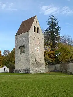 Der massive Turm aus Tuffsteinquadern diente auch als Wehrturm und Rückzugsort bei Gefahren. Er war ursprünglich nur über eine Leiter zugänglich. Das Erdgeschoss diente zeitweise als Gefängnis.