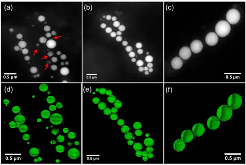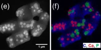 Mit verschiedenen Färb-, Kolorierungs- und Kontrastverfahren hergestellte Bilder von G. lithophora C7 Zellen, die zwei Monate lang in BG-11 gewachsen sind. (e) zeigt HAADF-STEM-Bilder mit hoher Vergrößerung von mehreren Zellen, die mittels EDXS-Mapping analysiert wurden; (f) zeigt eine Überlagerung, bei der jede Farbe einem Element entspricht, das durch ein Symbol mit der gleichen Farbe gekennzeichnet ist.[1][A. 1] | ||||||||||||