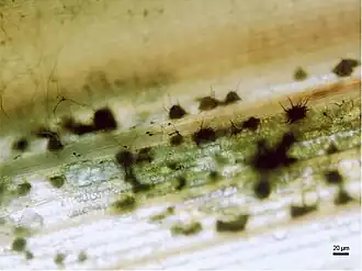 Acervuli von Colletotrichum sublineolum auf Sorghumhirse | ||||||||||||