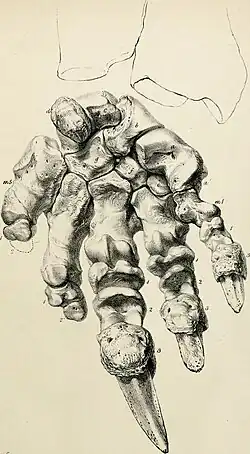 Der Aufbau der Hände und Füße ähnelte dem der anderen großen Mylodonten wie etwa Paramylodon, Mylodon und Lestodon, jedoch gibt es einzelne Abweichungen zueinander. Die Hand besaß insgesamt fünf Strahlen (I bis V), krallentragend waren aber nur die drei inneren Strahlen (I bis III). Die Mittelhandknochen nahmen vom ersten zum vierten Strahl an Größe zu, der dritte Metacarpus wurde teilweise bis zu 11 cm lang. Der fünfte erreichte wiederum die Ausmaße des dritten, besaß aber einen massiven und breiten Bau. Als Besonderheit der großen bodenbewohnenden Faultiere war der Mittelhandknochen des ersten Strahls mit dem großen Vieleckbein zu einer Einheit verwachsen (der sogenannte Metacarpal Carpal Complex oder MCC); ebenso fusionierten hier die ersten beiden Fingerglieder. An den Strahlen II und III bestanden jeweils drei Fingerglieder, die ersten beiden waren aber sehr kurz. Die jeweiligen Endglieder aller drei Innenstrahlen verfügten über ausgedehnte Krallenfortsätze, was auf dementsprechend große Krallen schließen lässt. Die Fortsätze erreichten Längen von bis zu 16,5 cm und eine Höhe von 4,8 cm. Die Fingerglieder der krallenlosen äußeren Strahlen waren in ihrer Anzahl und Größe stark reduziert.[18][19][20][21] Der Fuß wies insgesamt vier Strahlen (II bis V) auf, der innerste Strahl (I) war vollständig zurückgebildet. Krallen besaßen nur die Zehen II und III, die auch am kräftigsten ausgebildet waren. Die Mittelfußknochen der beiden inneren Strahlen besaßen nur kurze Längen, während die der äußeren, krallenlosen Zehen extrem massiv und lang wurden. Die beiden ersten Zehenglieder des innersten (zweiten) Strahls waren miteinander verwachsen und entsprachen damit dem ersten Strahl der Hand. Am nachfolgenden dritten Strahl bestanden drei Zehenglieder, was mit Lestodon übereinstimmt, aber markant von Paramylodon abweicht, bei dem hier teilweise ebenfalls nur zwei Glieder ausgebildet waren. Die jeweiligen Endphalangen mit Krallen wiesen analog der Hand einen äußerst kräftigen Bau auf und besaßen massive Krallenfortsätze. An den äußeren Strahlen waren die Anzahl und Größe der Zehenglieder wiederum vergleichbar zur Hand stark reduziert.[19][20]