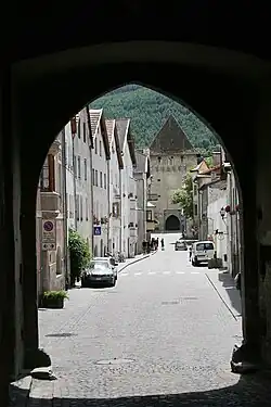 Das Tauferer Tor im Westen der Stadt. Im Hintergrund die Kirche St. Pankratius