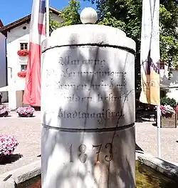 Auf dem Stadtplatz steht ein Brunnen mit der Aufschrift "Warnung/Jede Verunreinigung des Brunnen wird mit/15 Gulden bestraft./Der Stadtmagistrat./1873".
