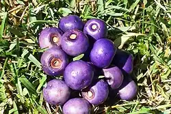 Auf den trockenen Steinfrüchten sind noch die vergrößerten Kelchblätter vorhanden.[2] Das Endokarp ist hart und das Mesokarp fleischig. Die Steinfrüchte enthalten vier oder, weil sich nicht alle Samenanlagen weiterentwickeln, zwei oder drei Samen.[3]