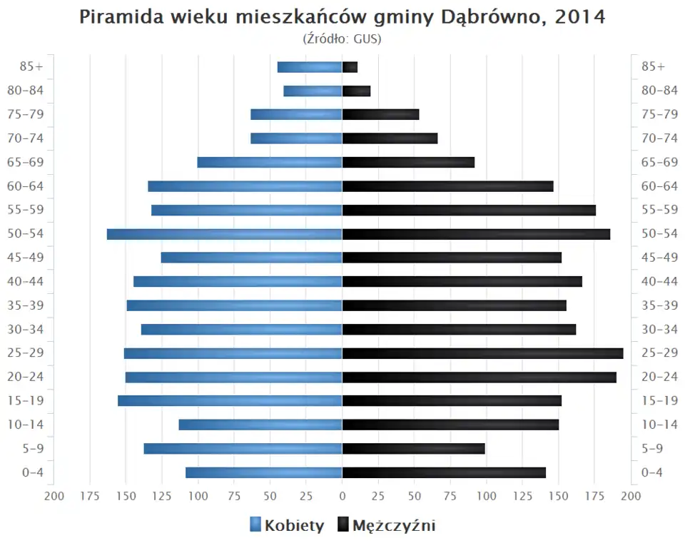 Im Gemeindegebiet wurden am 31. Dezember 2020 insgesamt 4235 Einwohner gezählt. Etwa 25 % von ihnen wohnen im Dorf Dąbrówno. Über ihre Altersstruktur gibt eine Aufstellung aus dem Jahre 2014 Auskunft:[2]