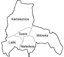 Die Landgemeinde (gmina wiejska) Milówka besteht aus fünf Dörfern mit einem Schulzenamt (sołectwo): Milówka, Laliki, Kamesznica, Nieledwia und Szare.