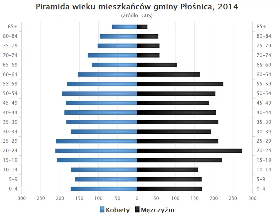 Am 31. Dezember 2020 zählte die Gmina Płośnica 5540 Einwohner. Über ihre Altersstruktur gibt eine Tabelle aus dem Jahre 2014 Auskunft:[2]
