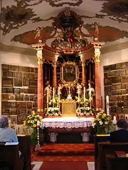 Der Innenraum mit bemalter Spiegeldecke hat seit 1947 eine barockisierende Deckenbemalung, in der die Aufnahme Mariens in den Himmel dargestellt wird. Gemalt wurde es von Johann Baumann aus München. Ausgestattet ist der Raum mit einem aufwändigen barocken Altar, in dem das in einem prunkvollen vergoldeten Rahmen gefasste Bild der Schwarzen Madonna, umringt von Engeln und Heiligen, präsentiert wird. Die Wände sind fast lückenlos mit Votivtafeln bedeckt. Aus einer Hostienrechnung von 1820 geht hervor, dass fast täglich Messen gelesen werden. Im Jahre 1907 wurde ein eigenes, 200 Seiten starkes Gebetbuch herausgegeben. Der Kirche flossen immer reichlich Spenden von Seiten der Gemeindemitglieder und der Pilger zu.