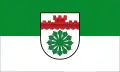 Hissflagge: „Die Flagge ist grün-weiß quergestreift mit dem aufgelegten Wappen in der Mitte.“ |