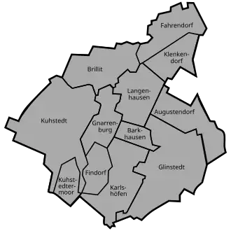 Am 1. März 1974 wurden die Gemeinden Augustendorf, Barkhausen, Fahrendorf, Findorf Klenkendorf, Kuhstedtermoor eingegliedert. Am 8. April 1974 kamen Brillit, Glinstedt, Karlshöfen, Kuhstedt und Langenhausen hinzu.[7][8]