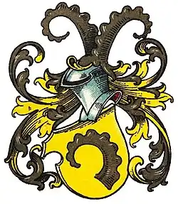Blasonierung: In Gold ein gekrümmtes schwarzes Gems- oder Widderhorn. Auf dem Helm mit schwarz-goldenen Helmdecken zwei schwarze Hörner.[3]