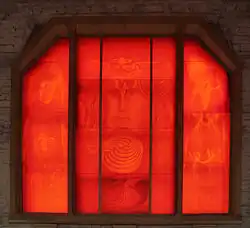 Der weitere Weg treppaufwärts zum Grossen Saal führt an ein – von aussen kaum erkennbares – rotes Fenster in Form eines Triptychons. Das Thema dieses Fensters sowie der weiteren im Grossen Saal ist die individuelle Entwicklung des Menschen, sein Streben nach Erkenntnis und Weiterentwicklung. Im linken Fenster blickt ein Mensch mit gesenktem Haupt von einem Berg; sein Blick aus Angst, Hass, Spott und Zweifel verstellt ihm den Blick der aufsteigenden gräulichen Tiere. Das mittlere Fenster stellt ein von Engeln umrahmtes, ernst blickendes Antlitz mit Lotusblumen dar. Die Einbindung dieses Individuums in den Kosmos wird durch angedeutete Tierkreisbilder des Löwen, des Stiers und mit dem Planeten Saturn dargestellt. Im unteren Teil ist eine Darstellung des Erzengels Michael, der Mut gefasst hat im Kampf mit dem Drachen. Im rechten Bild schliesslich haben die Wesen freien Ausblick auf geistige Höhen erlangt.[85]