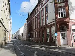 - Nr. 74: 3- bis 5-gesch. ehem. Lyzeum Schwerin von 1914 (D) mit Freiflächen auf dem ehem. Domfriedhof nach Plänen von Stadtbaumeister Hans Dewitz;[2] heute saniertes Gymnasium Fridericianum Schwerin mit einem neuen 4-gesch. Anbau von um 2000