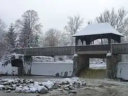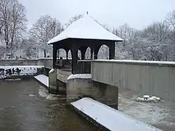 Das ehemalige Goggeleswehr und darüber die ehemalige Goggelesbrücke mit ihrem überdachten Holzaufbau aus dem Jahr 1921 von der Unterwasserseite gesehen (2005)