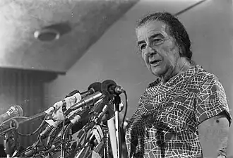 Die israelische Politikerin Golda Meir, die als Kind mit ihrer Familie von Kiew in die Vereinigten Staaten floh, war von 1956 bis 1965 erst Außenministerin und von 1969 bis 1974 Ministerpräsidentin Israels. Sie war die erste Frau in diesem Amt. In ihrer Regierungszeit wurde sie auch als „eiserne Lady“ von Israel bezeichnet.[2][3] Wegen des anfangs erfolgreichen arabischen Überraschungsangriffs geriet Meir am Ende des Jom-Kippur-Kriegs von 1973 in heftige innenpolitische Kritik.