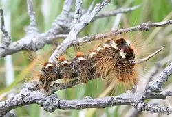 Die Raupen sind etwa 35 bis 40 Millimeter lang, grauschwarz gefärbt, mit einer rot-weißen Zeichnung versehen und besitzen eine lange Behaarung. Sie ernähren sich meist von Laubhölzern wie Eichen, Kirsch-, Pflaumen-, Apfel- und Birnbäumen.