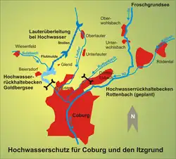 An der oberen Itz ist seit 1986 das Rückhaltebecken Froschgrundsee in Betrieb. Das Hochwasserrückhaltebecken Goldbergsee Coburg oberhalb von Coburg-Neuses staut vorrangig den Sulzbach auf. Zusätzlich werden die Hochwasser aus dem Lautertal, die mehr als 4 m³/s betragen, bei Bedarf über einen Freispiegelstollen mit einer Gradiente von 0,771 % und eine Flutmulde in den Goldbergsee übergeleitet. Diese technischen Maßnahmen werden durch ökologische Umgestaltungen der genannten Flüsse ergänzt. Dadurch wird der Hochwasserabfluss auch auf natürliche Weise verzögert.