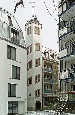 Bei dem Bombenangriff auf Leipzig vom 4. Dezember 1943 wurde die Goldene Fahne weitgehend zerstört, der Korpus des Treppenturmes blieb erhalten. Als von 1960 bis 1963 an der Stelle der Goldenen Fahne ein abgewinkelter Wohnblock errichtet wurde, wurde an seiner Südwestecke als eine ideale Verbindung von Alt und Neu der restaurierte historische Treppenturm mit seinen schrägen Fenstern und seiner Dachhaube mit Spitze einbezogen. Allerdings ist er bis auf einen Zugang zum Dachboden des Hauses mit ihm nicht funktionell verbunden. Architekt des Baus war Frieder Gebhardt.[4][5] Turm und Wohnhaus wurden Mitte der 1990er-Jahre saniert.