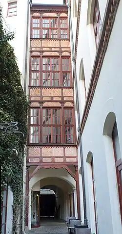 Die schmale Rückseite des Vorderhauses zwischen den Seitenflügeln trägt eine mit Ziegeln ausgemauerte Fachwerkfassade. Nach einem kurzen viergeschossigen Stück fallen die Seitenflügel auf zwei Stockwerke ab. Ihre Verladeluken belegen noch ihre ehemalige Wirtschaftsfunktion.
