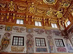 Bis zu ihrer Zerstörung im Zweiten Weltkrieg war die Kassettendecke an 27 Ketten am Dachgebälk des Rathauses aufgehängt.