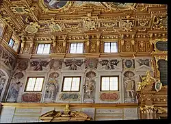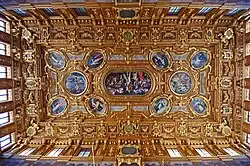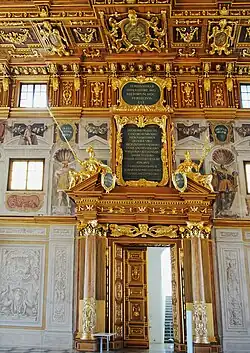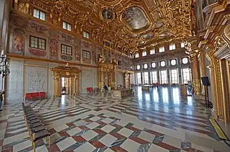 Der Goldene Saal bildet das Kernstück des Augsburger Rathauses, das in den Jahren 1615 bis 1620 nach Entwürfen von Elias Holl als Kaisersaal sowie repräsentativer Rahmen für die Reichstage erbaut wurde. Die aus Nussbaum geschnittene vergoldete Kassettendecke fertigte der Zimmermeister Wolfgang Ebner von 1619 bis 1622.[1] Das Bilderprogramm schuf Johann Matthias Kager nach Ideen des Jesuiten Matthäus Rader und nach Vorzeichnungen des Münchner Hofmalers Peter Candid.[2] Der Innenausbau war im Wesentlichen bis 1624 abgeschlossen, die Fertigstellung des Goldenen Saales verzögerte sich bis in das Jahr 1643.