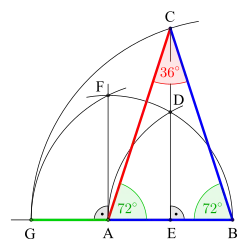 Die oben beschriebene Zerlegung von in die Teildreiecke und liefert beide Formen des Goldenen Dreiecks. Beide Formen treten also stets gemeinsam auf.[10] Sie ergeben sich regelmäßig bei der Konstruktion mit Zirkel und Lineal von regulärem Fünfeck und regulärem Zehneck. Die Winkel , und sind also allein mit Zirkel und Lineal konstruierbar.[11]