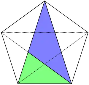 Mit den Ähnlichkeitssätzen ergibt sich, dass entweder oder zu ähnlich ist. Daraus zieht man die Folgerung, dass die Innenwinkelsumme gleich dem Fünffachen des kleinsten Winkels ist. Folglich ist einer der Winkel gleich . Ist dies der Winkel an der Spitze von , so ist ein Goldenes Dreieck erster Art. Ist es ein Basiswinkel, so ist ein Goldenes Dreieck zweiter Art. Mit dem Innenwinkelsummensatz ergibt sich dann, dass im ersten Fall das Innenwinkeltripel gleich sein muss, im zweiten Fall dagegen allein in Frage kommt.[4][5]