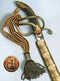 Die Tradition des Ehrenschwertes geht in Russland auf das 17. Jahrhundert zurück, das älteste Exemplar enthält auf der Klinge die Inschrift: „Seine Majestät, der König und Großfürst aller Reußen Michail Fjodorowitsch verleiht dieses Schwert an Bogdan Khitrovo Matveeva“. Am 27. Juli 1720 verlieh Zar Peter I. ein Goldenes Schwert mit Brillanten an Mikhail Golitsyn. Seit dieser Zeit wurden 300 Ehrenschwerter mit Diamanten verliehen, davon 250 während der Regierungsperiode Katharinas II. (1729–1796). Der Geldwert wurde damals auf etwa 11.000 Rubel geschätzt. Im Verlauf des Russisch-Österreichischen Türkenkrieges wurden seit 1788 die Schwerter mit der Inschrift „Für Tapferkeit“ der „Ortsbezeichnung“ und einem stichwortartigen „Ruhmesblatt“[1] versehen, bis 1790 wurden 84 dieser Goldenen Schwerter im Einzelwert von etwa 560 Rubel verliehen. Eine außergewöhnliche Anfertigung eines Goldenen Schwertes befindet sich im Museum zur Geschichte der Donkosaken[2] in Nowotscherkassk. Es ist ein Schwert, das Zarin Katharina II. im Jahre 1796 anlässlich des Russisch-Persischen Feldzugs Graf Matwei Iwanowitsch Platow überreichte, mit einer Klinge aus Damaszener Stahl, einem Schwertgriff aus purem Gold, mit 130 Smaragden und Diamanten besetzt, einer hölzernen Scheide, die mit Samt überzogen und mit 306 Diamanten, Rubinen und Bergkristallen verziert ist.