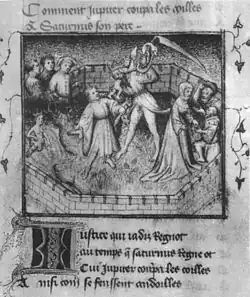 Der Sturz Saturns, der von seinem eigenen Sohn Jupiter entthront wurde, setzte dem Goldenen Zeitalter ein Ende und führte alle Übel der folgenden Zeiten herbei, denn nun erlosch der Kult des wahren Gottes. Mit dem Untergang der rechten Gottesverehrung war zwangsläufig das Verschwinden der Gerechtigkeit und der Solidarität und das Aufkommen der Laster und Verbrechen verbunden. In Jupiter sieht Laktanz einen verbrecherischen Menschen, der sich als Gott verehren ließ, was schließlich zur Einführung des Polytheismus führte, da auch Jupiters Nachkommen göttliche Verehrung erhielten.[35]