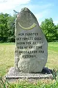 1907, als Süderjütland/Nordschleswig deutsch war, wurden in Gallehus zwei Gedenksteine aufgestellt. Der Historiker Peter Lauridsen hatte die genauen Fundstellen lokalisiert und Otto Didrik von Schack kontaktiert, auf dessen Gutsbesitz Schackenborg der Fundort lag. Zweck der Gedenksteine war, durch den Verweis auf die nordgermanischen Prunkobjekte den dänischen Anspruch auf ein urdänisches Territorium festzuschreiben.[10] Wäre eine dänische Inschrift von den preußischen Behörden nicht genehmigt worden, hätten auch die Namen der Finder allein (Kristine Svensdatter und Erik Lassen) die gewünschte nationale Aussage ermöglicht, so die Meinung der Initiatoren. Jedoch konnte das Projekt auch in dänischer Sprache verwirklicht werden, nachdem Nordschleswig 1920 wieder zu Dänemark gekommen war. Ironischerweise mussten die Steine aus dem Harz herangeschafft werden, weil das Marschland der Umgebung keine Findlinge aufweist und der Import von Granit aus Bornholm zu kostspielig geworden wäre.
