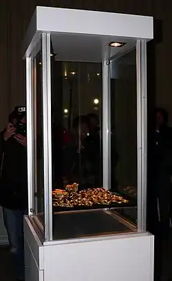 Vom 21. September 2018 bis 6. Januar 2019, anfangs nur in Teilen, wurde der Goldhort im Martin-Gropius-Bau in Berlin in der Ausstellung Bewegte Zeiten. Archäologie in Deutschland gezeigt, die aus Anlass des Europäischen Kulturerbejahres 2018 stattfand.[82] Es war die erste vollständige Ausstellung außerhalb des Niedersächsischen Landesmuseums Hannover.[83]