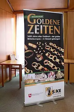 Der Goldhort war Mittelpunkt der Sonderausstellung Im Goldenen Schnitt – Niedersachsens längste Ausgrabung[77][78], die zwischen August 2013 und März 2014 im Niedersächsischen Landesmuseum gezeigt wurde. Thema waren die zwischen 2010 und 2013 vorgenommenen Ausgrabungen auf der Trasse der Nordeuropäischen Erdgasleitung. Sie stellten das bisher größte Archäologieprojekt in Niedersachsen dar und führten mit etwa 150 Fundstellen zur Entdeckung weitgehend unbekannter Siedlungsstellen sowie Gräberfelder. Die Ausstellung umfasste neben dem Goldhort rund 250 Exponate.[79] Dabei werden acht Fundstellen, die während des Pipelinebaus in Niedersachsen entdeckt wurden, näher vorgestellt.[80]