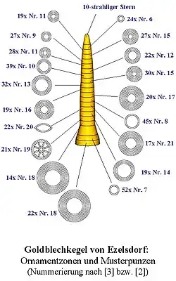 Daneben treten häufig Zierbänder mit dreifach gekoppelten Punktbuckeln (12 solcher Punktbuckelbänder gegenüber 20 Bändern mit Kreismotiven) auf. Als Besonderheit ist das jeweils einmalige Auftreten eines Zierbandes, bestehend aus achtspeichigen Rädern bzw. aus augen- bzw. mandelförmigen Buckeln, zu würdigen. Die Kegelspitze wird von einem zehnstrahligen unkonturierten Stern bekrönt, dessen Hintergrund mit Punktbuckeln unterlegt ist.