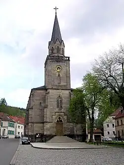 Im Jahr 1855 prägte Bayern sogar Golddukaten aus diesen Bergwerken mit dem Konterfei Maximilians II. Am 24. Juni 1836 ereilte Goldkronach die letzte große Brandkatastrophe. Der gesamte östliche Teil der Stadt fiel dem Feuer zum Opfer, insgesamt verloren 127 Familien ihr Zuhause, beide Schulhäuser und das Rathaus wurden ebenfalls zerstört. Mit Aufbauhilfe aus umliegenden Städten, aus Bayreuth, Würzburg, Wunsiedel oder Nürnberg konnte Goldkronach wieder aufgebaut werden. Viele der heute existierenden Häuser des Stadtkerns wurden so in den Jahren 1836 und 1837 errichtet; das denkmalgeschützte Ensemble des Marktplatzes und das Straßenbild weist daher deutliche Züge des Biedermeier auf.[21] Auch die heutige Stadtkirche St. Erhard wurde nach diesem Brand errichtet. Die Grundsteinlegung erfolgte 1841, elf Jahre später wurde die Kirche geweiht.