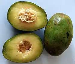 Es werden rundliche bis ellipsoide Steinfrüchte von 5 bis zu 10 Zentimeter Länge und einem Gewicht von bis zu 500 Gramm gebildet. Der bis fünffächrige, poröse und braune Steinkern hat kein (normales) Endokarp, sondern eines mit weißen, knochigen und fransigen, spitzigen Auswüchsen. Im harten und 2,5 bis 3,7 Zentimeter langen Steinkern sitzen ein bis fünf Samen. Die Früchte reifen während des ganzen Jahres. Die Früchte stehen zu zweit bis zwölft an hängenden Fruchtständen. Die Schale ist dünn, fest und zu Beginn grün. Bei der Reife werden Schale und Fruchtfleisch orange-gelb. Das Mesokarp wird saftig, säuerlich und bekommt einen ananasartigen Geschmack. Wenn die Frucht weich wird, bekommt sie einen moschusartigen Geruch. Das Fruchtfleisch hat folgende Zusammensetzung: 0,5 bis 0,8 % Protein, 0,3 bis 1,8 % Fett, 8 bis 10,5 % Zucker, 0,85 bis 3,6 % Rohfasern.