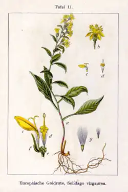 Wirksamkeitsbestimmende Inhaltsstoffe sind Flavonoide, Saponine, Phenylglykoside, Gerbstoffe sowie ätherisches Öl. Als Leitsubstanzen gelten Leiocarposid und Virgaureosid. Seit Mitte des 20. Jahrhunderts wird auch das Kraut der Riesengoldrute (Solidaginis giganteae herba) eingesetzt, es ist jedoch klinisch weniger erforscht.[14]