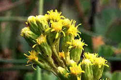 In ganz unterschiedlich aufgebauten, oft auch verzweigten Blütenständen stehen meist viele (zwei bis 1500) kleine körbchenförmige Teilblütenstände; sehr selten stehen die Blütenkörbchen einzeln. Die Blütenkörbchen sind glockenförmig bis zylindrisch und weisen Durchmesser von 1,7 bis 10 Millimetern auf. Der Körbchenboden ist von zehn bis 35 Hüllblättern in drei bis fünf Reihen umgeben. Im Blütenkörbchen stehen am Rand meist zwei bis 15 (selten fehlen sie oder es sind bis zu 24) Zungenblüten und im Zentrum meist zwei bis 35 (selten bis zu 60) Röhrenblüten. Die Zungenblüten, auch Strahlenblüten genannt, sind zygomorph, weiblich, fertil, meist ungehaart und meist gelb oder selten weiß. Die radiärsymmetrischen Röhrenblüten, auch Scheibenblüten genannt, sind gelb, zwittrig, fertil und fünfzähnig.