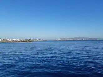 ![]() Blick von der Stadt Kos auf einen Teil des Golf von Kos Richtung Cap Ammoudia und die türkische Küste | ||