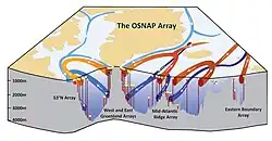 Das OSNAP-Programm (Overturning in the Subpolar North Atlantic Program) hat die AMOC von 2014 bis 2016 im besonders wichtigen subpolaren Nordatlantik überwacht, wo die Tiefenwasserbildung stattfindet. Es verwendete ein Netzwerk von Verankerungen, Gleitern und Satelliten, um Temperatur, Salzgehalt und Strömungen zu messen. OSNAP hat gezeigt, dass die Tiefenwasserbildung in der Labradorsee und der Grönlandsee starken saisonalen und jährlichen Schwankungen unterliegt. Ursächlich dafür sind aber wohl nicht Schwankungen in der Labradorsee, sondern in der Meeresregion östlich von Grönland: In der dortigen Irmingersee und dem Island-Becken ist die Variabilität rund siebenmal stärker als in der Labradorsee. Die Daten sind wichtig, um die Prozesse der Tiefenwasserbildung besser zu verstehen.[46]