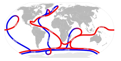 Im Nordatlantik vereint sich dieses Tiefenwasser mit dem aus der Labradorsee stammenden Wasser zu einem kräftigen tiefen Randstrom, der sich südwärts bewegt und die ozeanischen Becken mit neu gebildetem Nordatlantischem Tiefenwasser füllt. Dieses breitet sich dann entlang des Meeresbodens bis weit nach Süden aus und fließt zurück in den Südatlantik.[14] Im Südatlantik und im Südlichen Ozean vermischt sich das NADW mit anderen Wassermassen wie dem antarktischen Bodenwasser (Antarctic bottom water – AABW), das salzärmer ist, und steigt schließlich in einigen Regionen wieder an die Oberfläche, insbesondere in Gebieten mit starken Winden und Auftriebsprozessen, wie vor der Küste Südamerikas oder im Südlichen Ozean.