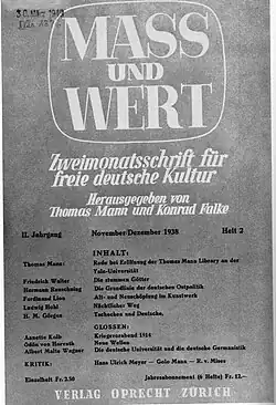 Anfang 1939 emigrierte Golo Mann nach Princeton, New Jersey, wo sein Vater eine Gastprofessur übernommen hatte. Nach einigem Zögern kehrte er, trotz des sich anbahnenden Kriegsausbruches, im August des Jahres nach Zürich zurück, um nach zahlreichen Beiträgen als Mitarbeiter auf Wunsch seines Vaters im November des Jahres die Chefredaktion der deutschsprachigen Exilzeitschrift Mass und Wert, herausgegeben von Thomas Mann und Konrad Falke, übernehmen zu können. Die Zweimonatsschrift für freie deutsche Kultur erschien von Herbst 1937 bis September 1940 in insgesamt 17 Ausgaben.[21]