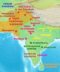 Er gilt als der Begründer des Indo-Parthischen Königreiches und war wohl ein parthischer Lokalfürst, bevor er König wurde. Gondophares regierte von 20 n. Chr. bis etwa 50 n. Chr. Gondophares ist nur von Münzen und einer Inschrift aus Takht-i-Bahi bekannt (dieser Fundort der Inschrift ist nicht ganz sicher), wo er als Maharaja Guduvhara erscheint. In dieser Inschrift ist ein 26. Regierungsjahr bezeugt. Dieses Jahr fällt in das Jahr 103 einer nicht genannten Ära, aber wohl die des indo-skythischen Herrschers Azes I., die als Vikrama-Ära bekannt ist.[1] Diese Ära beginnt 57 v. Chr., womit der Beginn der Regierungszeit von Gondophares genau auf 20 n. Chr. berechnet werden kann. Die Inschrift hat eine Weihung seitens eines lokalen Adligen zum Inhalt, nennt aber auch einen Prinzen Kapa (erjhuna Kapa), der vielleicht mit dem ersten Kuschanaherrscher Kujula Kadphises zu identifizieren ist.[1]