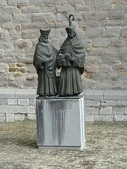 Statuen von Monulphus (links) und Gondulphus (rechts) an der Südwestecke der St. Servatiusbasilika in Maastricht von dem Bildhauer Jef Courtens aus dem Jahr 1993