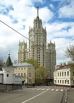 - Hausnummer 38 – Ein monumentalisches, vierzehnstöckiges Wohngebäude mit Kolonnade, Skulpturen und Bogen, auch im Stil des Stalinistischen Klassizismus. Architekt – N. Wischnewski und G. Worobjow. Das Gebäude wurde nach Plan der Rekonstruktion der Straße Gontscharnaja 1935 errichtet. Sein zentrales Korps wurde 1936–1939 errichtet für das Volkskommissariat für Verteidigung und wurde während des Kriegs durch deutsche Luftangriffe etwas beschädigt. Beide Flügel wurden von deutschen Kriegsgefangenen 1946 erbaut.[3][4]