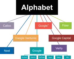 Google gehört seit dem 2. Oktober 2015[6] zu Alphabet. Durch eine Umstrukturierung wurden die Google-Aktien in Alphabet-Aktien umgewandelt und das Unternehmen in mehrere Subunternehmen, welche Alphabet Inc. zugehören, aufgeteilt.[7][8] Das Kerngeschäft der Online- und Internetdienste wurde unter dem Namen Google fortgeführt. Der vorige Google-Chef Larry Page wechselte zusammen mit Sergey Brin an die Spitze der neu geschaffenen Holding. Die Führung von Google übernahm Sundar Pichai.[9]