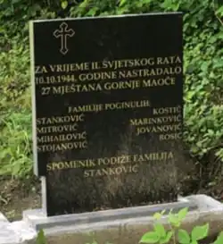 Am 10. Oktober 1944, wurde im Dorf eine „Säuberungsaktion“ durch Angehörige der kroatischen SS-Division „Handschar“ durchgeführt. Dabei wurden die Einwohner in ein Haus getrieben, beschossen, und das Haus wurde anschließend angezündet. Dabei starben 25 Menschen[5], nur drei überlebten verletzt.