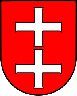 Blasonierung: „In Rot zwei übereinanderstehende schwebende angetatzte silberne Kreuze.“ |
